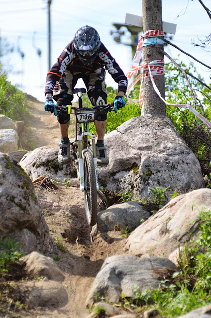 The most hard thing for me was climbing the hill 3 times without a lift, because I was not well trained in the beginning of the season. Flat pedals didn't give me opportunity to go fast on rooty "cross-country" uphills and flats. Steep headtube angle sometimes made me stuck in a rocky section of stage 1b. As a result 89 place of more than 200 riders.